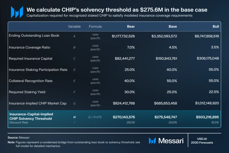 CHIP is modeled as backstop capital inside the insurance coverage module. This lens estimates the absolutely diluted valuation required for staked and acknowledged CHIP to fulfill said protection necessities beneath specific assumptions about publicity, protection ratios, staking participation, collateral recognition, and required staking yield. The output represents a solvency-consistent capitalization stage, not a worth goal.