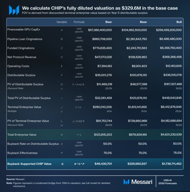 CHIP is greatest understood as a governance and risk-policy asset working throughout two distinct financial mechanisms. The excess-driven pathway will depend on governance allocating distributable surplus towards buybacks and sustaining that coverage over time. Individually, the insurance-capital-implied solvency threshold displays the capitalization required if CHIP is relied upon as acknowledged backstop capital inside the protocol’s protection framework, the place required protection ratios and collateral recognition effectivity decide capital depth. Underneath our modeled eventualities, buyback-supported FDVs vary from $46.4 million (bear) to $329.6 million (base) and $1.74 billion (bull). The insurance-capital-implied solvency thresholds vary from $270.1 million (bear) to $275.6 million (base) and $503.2 million (bull).