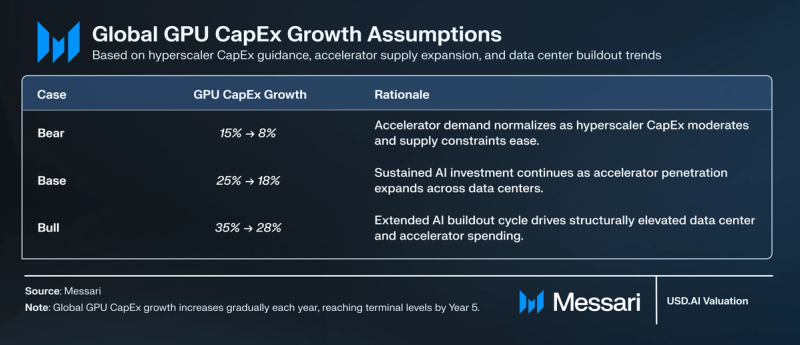Assumes AI infrastructure development decelerates meaningfully as provide constraints ease and hyperscaler CapEx normalizes. GPU system spending continues to broaden however transitions towards a extra mature mid-cycle development profile by 12 months 5. - Base case: 25% (12 months 1) → 18% (12 months 5)