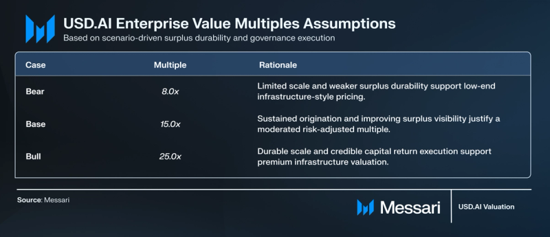 - Bear (8×): Assumes restricted scale and weaker confidence in sturdy surplus formation and capital return coverage, leading to infrastructure-like low-end pricing.