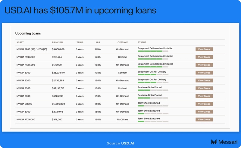 As soon as collateral is verified and accepted, USD.AI originates stablecoin-denominated loans backed by that {hardware}. Borrower onboarding, underwriting, and authorized structuring happen offchain, whereas mortgage balances, repayments, and associated financial flows are recorded and managed onchain.