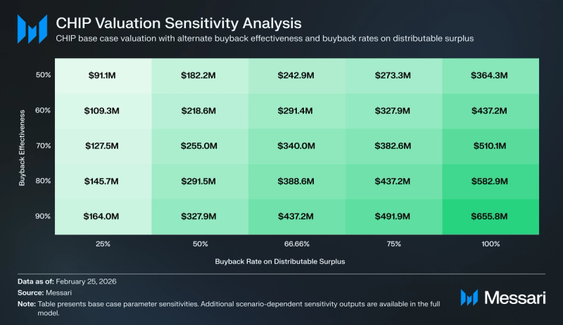 The buyback-supported lens evaluates CHIP as a governance asset which will seize worth by discretionary surplus allocation. A portion of distributable surplus could also be directed towards token buybacks, topic to DAO coverage. This pathway is modeled explicitly as a governance selection somewhat than a contractual entitlement.
