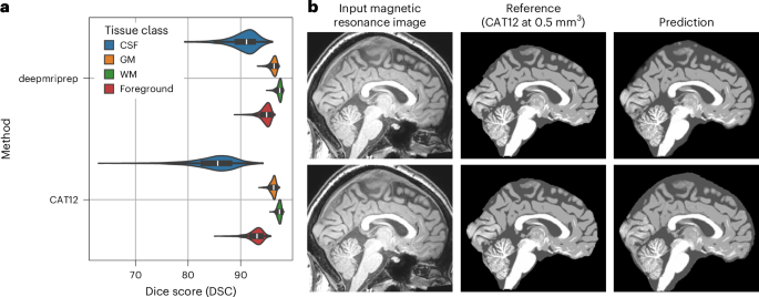 The entire deepmriprep pipeline used earlier than the GLM evaluation within the ‘VBM analyses’ part within the ‘Outcomes’ consists of six steps: mind extraction, affine registration, tissue segmentation, tissue separation, nonlinear registration and smoothing. After mind extraction utilizing deepbet14 with default settings, affine registration is utilized utilizing the sum of the MSE (between picture and template) and Cube loss (between picture mind masks and template mind masks). The affine registration is carried out in torchreg60 with zero padding—smart after mind extraction—and the default two-stage setting with 500 iterations in 12-mm3 and successive 100 iterations in 6-mm3 picture decision. After tissue segmentation (see ‘Tissue segmentation’ part within the Strategies) and earlier than picture registration (see ‘Picture registration’ part within the Strategies), we apply GM masking within the ventricles and across the mind stem to adapt the likelihood masks to an undocumented step within the present CAT12 preprocessing (see ‘Grey matter masking’ part within the Supplementary Data). After picture registration of the GM and WM likelihood masks, Gaussian smoothing with a 6 mm full width at half most kernel is utilized. Consistent with all earlier steps, smoothing (a easy convolution operation) is carried out in PyTorch, enabling graphics processing unit acceleration all through your entire prediction pipeline.