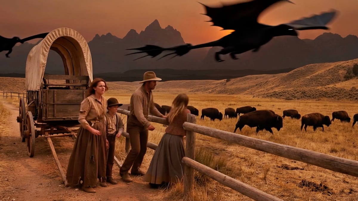 A household of settlers, admiring a herd of bison, breaks right into a run as two demonic winged creatures fly overhead. The little woman passes by way of a fencepost like a ghost.