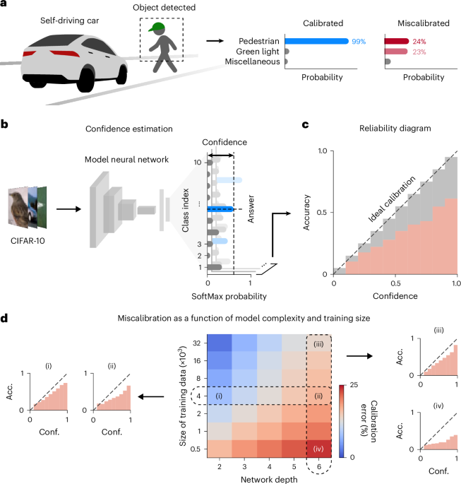 To research the sample of confidence miscalibration in deep neural community fashions, we first used a feed-forward neural community designed for sample classification of three-channel pure photos (32 × 32 × 3) into ten classes (Fig. 1b and Strategies). The community consists of a number of hidden layers with rectified linear unit nonlinearities and a last classification layer that makes use of the SoftMax perform. For a given picture pattern, the mannequin outputs chances for every object class, and the expected label corresponds to the class with the utmost likelihood. The mannequin additionally supplies a measure of prediction confidence, which is derived from the likelihood assigned to the expected class. The predictive uncertainty might be quantified because the distinction between the arrogance worth and one. Ideally, a neural community is anticipated to output calibrated confidence, the place the arrogance stage precisely displays the precise probability of the prediction being right (Fig. 1c and Supplementary Fig. 1). Against this, a poorly calibrated community might output confidence ranges that don’t correspond to the precise probability of correctness, resulting in potential misinterpretations of the mannequin’s predictions.