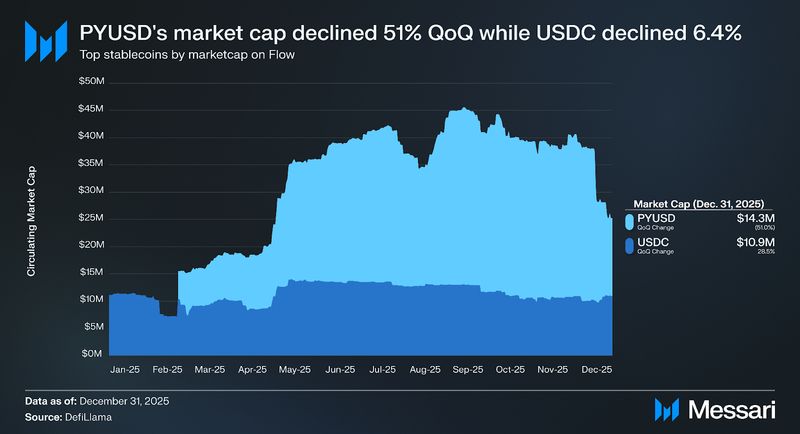 PYUSD’s circulating provide fell from $29.3 million to $14.3 million by the top of This fall, capturing 56.8% of the overall stablecoin market share on Circulation. In the meantime, the provision of the long-standing stablecoin, USDC, declined by 6.4% to $10.9 million. On account of PYUSD’s bigger decline, USDC’s market share elevated from 28.5% to 48.3%. For shopper DeFi, stablecoin reliability issues greater than issuer range as USDC’s elevated share truly simplifies the denominator for financial savings merchandise, just like how stFLOW does with LSTs. Merchandise can quote yields in a single, extensively trusted unit of account slightly than managing multi-stablecoin publicity. Nevertheless, if Circulation’s shopper finance layer turns into primarily USDC-denominated, it can inherit Circle’s coverage and redemption dependencies.
