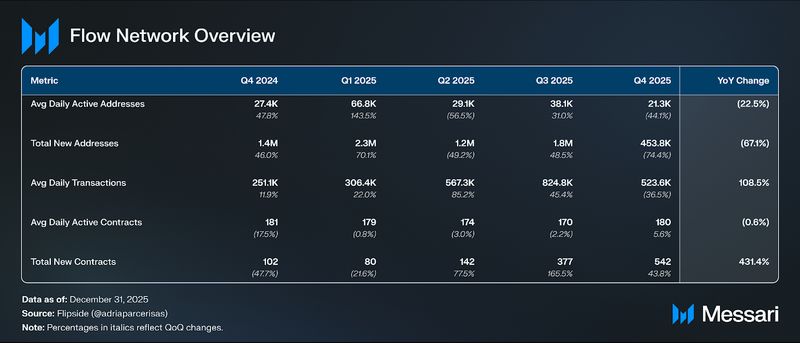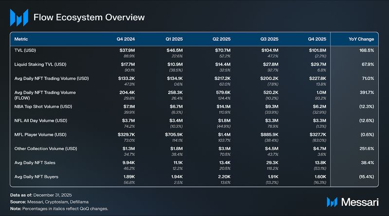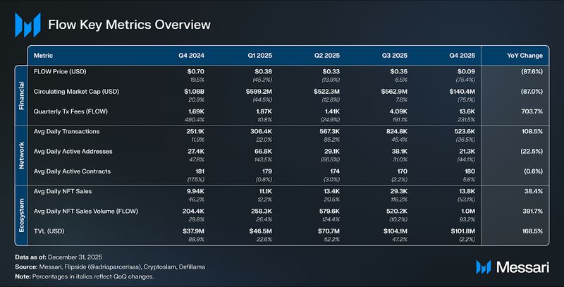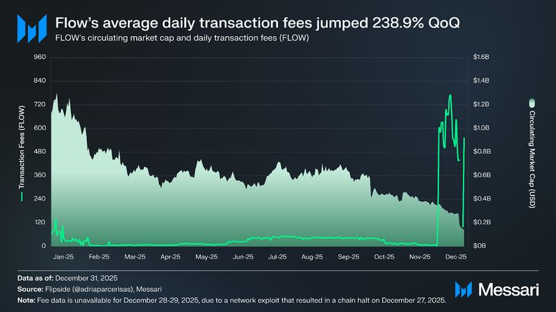 - FLOW’s value fell 75.4% QoQ to $0.09, bringing the circulating market cap down 75.1% to $140.4 million, because the Dec. 27, 2025, safety exploit compounded broader market weak spot and triggered alternate withdrawal halts throughout a number of platforms.