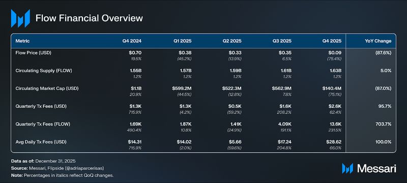 FLOW is the native token of Circulation that’s used (i) as the first medium of alternate on Circulation and (ii) for staking to facilitate numerous staking-related capabilities. In This fall 2025, FLOW’s value fell 75.4% QoQ to $0.09. A good portion of the drop occurred in the course of the December 2025 safety exploit and will not mirror Circulation’s fundamentals.