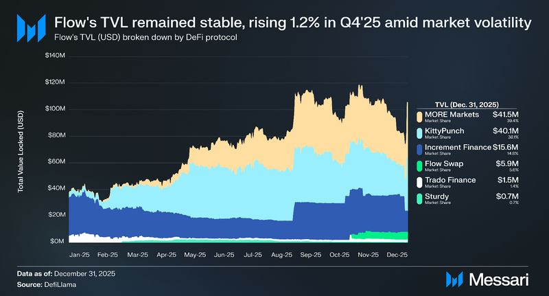 In consequence, the first driver of development was Ankr’s ankrFLOW, which elevated its TVL to $28.1 million, sustaining its place because the dominant LST on the community. Increment’s stFLOW fell 72.9% QoQ to $1.7 million, inflicting its market share to say no to five.6% from 22.0% by the top of the quarter. Whereas Increment didn’t discontinue service on Circulation, ankrFLOW provided deeper DeFi composability throughout MORE Markets, KittyPunch, and Increment’s personal AMM swimming pools. This consolidation is definitely constructive for Circulation’s roadmap as a single dominant LST simplifies integration for downstream merchandise. When FCM and Peak Cash route consumer deposits into staking yield, they’ll depend on a single liquid, well-integrated asset slightly than splitting throughout a number of LST suppliers with various liquidity profiles.