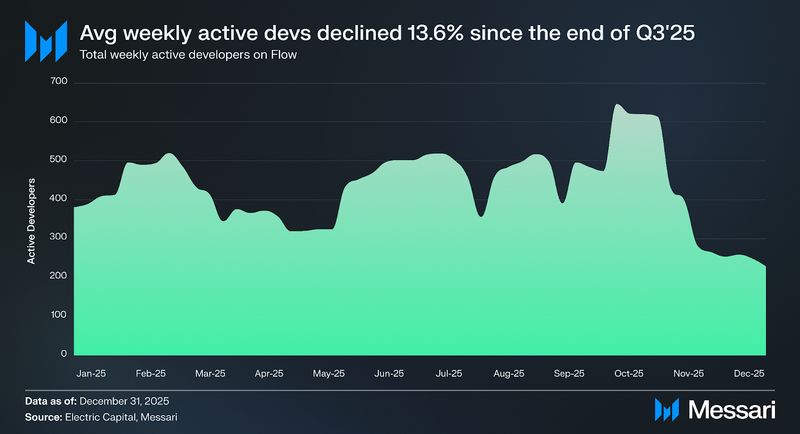 Common weekly lively developer rely fell 13.6% to 411 for the reason that finish of Q3’25. The This fall decline in weekly lively builders adopted the conclusion of Q3’s concentrated hackathon cycle, together with three ETHGlobal occasions and a ReWTF dash. This fall’s main builder occasion was Forte Hacks, Circulation’s flagship hackathon tied to the Forte mainnet launch. The occasion drew over 3,300 registered builders and produced greater than 400 undertaking submissions throughout tracks sponsored by Disney, Dune Analytics, Dapper Labs, and others, with a complete prize pool of $250,000. The size of Forte Hacks was important, however its format concentrated commit exercise right into a narrower window than earlier hackathons that ran alongside multi-day in-person occasions. Mixed with the pure post-hackathon lull at year-end, this timing sample explains the QoQ decline within the weekly common with out indicating an precise lack of developer curiosity. Total, 2025 was nonetheless the very best yr for developer exercise in Circulation’s historical past (per Electrical Capital).