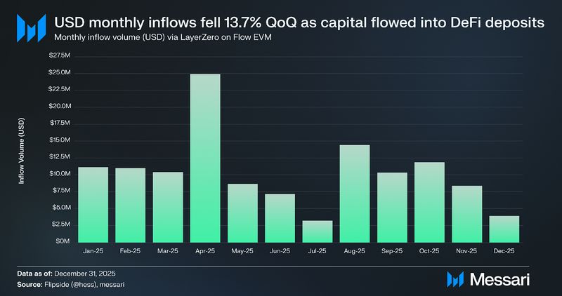 Common day by day transactions on Circulation EVM decreased 30.1% QoQ to 198,870, constructing on the degrees seen on the finish of Q2 following LayerZero’s integration in February 2025. Inflows by means of LayerZero averaged $383,550 per day, a 52.5% QoQ enhance from $251,450. The divergence between declining EVM transactions and rising LayerZero inflows means that cross-chain capital was flowing into DeFi deposits slightly than into high-frequency buying and selling exercise, in keeping with Circulation’s new route. MORE Markets and KittyPunch, which collectively held 77.5% of Circulation’s DeFi TVL by quarter-end, each settle for bridged stablecoins as collateral. Stargate’s USDF routing made it simpler to maneuver stablecoin liquidity into Circulation EVM from Ethereum and Solana, that means the influx uptick probably displays elevated DeFi positioning slightly than retail transaction quantity. LayerZero’s rising adoption validates that this bridge infrastructure permits merchandise like Peak Cash to onboard consumer deposits from different chains with out requiring handbook bridging steps.