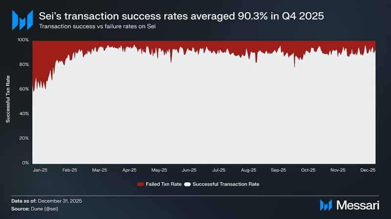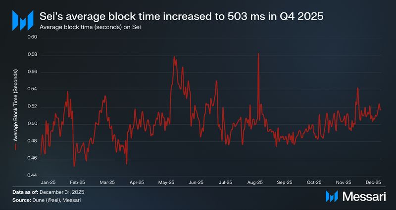 In December 2024 and January 2025, Sei skilled a surge in transaction failure charges, rising to 22.7% and 29.7%, respectively. Since then, failure charges normalized all through the remainder of 2025, falling to 12.5% in February and 6.4% in March, and stabilizing later within the 12 months at 9.8% in Q3’25 and 9.7% in This autumn‘25. This level is broadly consistent with other high-throughput networks, with Base averaging 9.6% and Solana averaging around 6% transaction failure rate over the same period. Meanwhile, average block times on Sei remained flat, going from an average of 499ms in Q3’25 to 503ms in This autumn’25, a 0.8% QoQ improve.