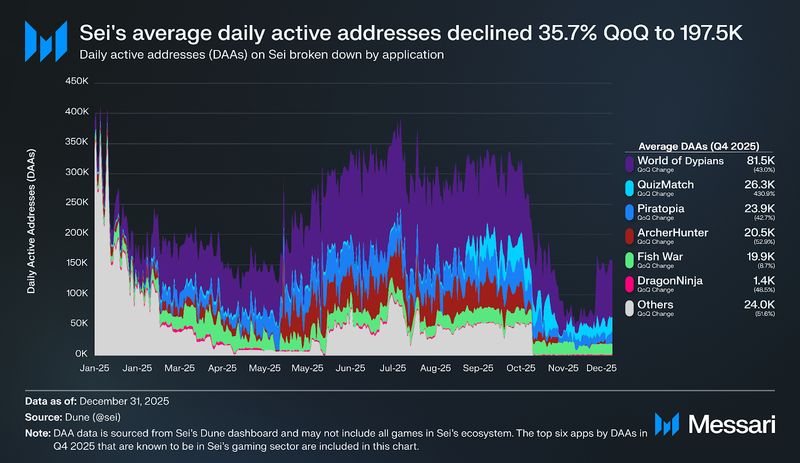 Sei’s gaming ecosystem retraced from the brand new highs set in Q3’25, with a complete of 28 million gaming-related transactions, a lower of 28.4% from 39.2 million in Q3’25. By way of each day lively addresses (DAAs), common DAAs in Sei’s gaming sector had been 197.5K, down 35.7% QoQ from 307.2K in Q3’25. World of Dypians remained a standout because the main sport by common DAAs in This autumn’25, whereas QuizMatch helped offset broader declines, and Piratopia noticed a smaller pullback than most different titles.