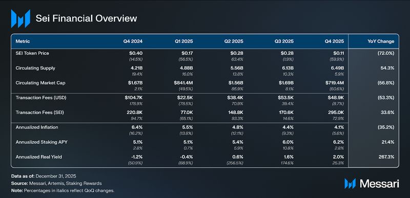 Annualized inflation fell from 4.4% to 4.1% in This autumn’25. Mixed with a 2.9% QoQ lower within the quantity of staked SEI, annualized staking APY elevated from 6% to six.2%. This resulted within the third quarter, during which SEI stakers skilled a optimistic annualized actual yield, with this quarter’s annualized actual yield being 2%.
