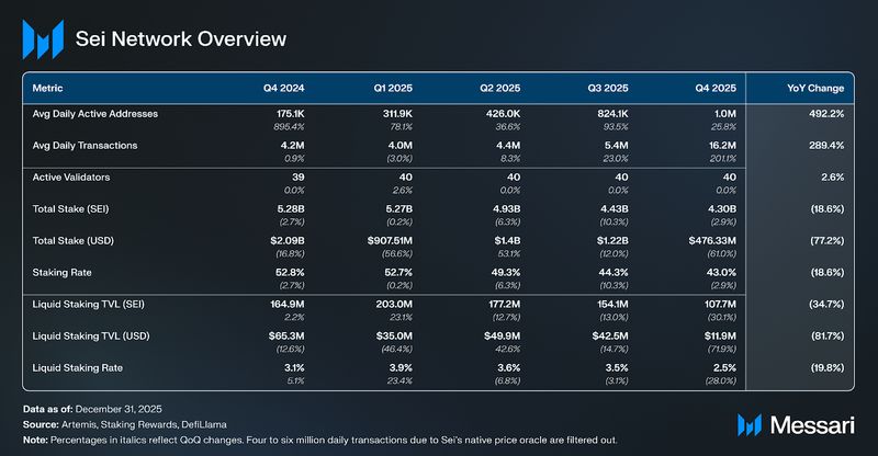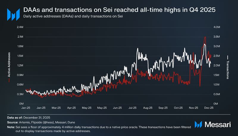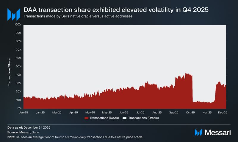 Consumer exercise was a shiny spot as Sei prolonged its development streak to a sixth consecutive quarter, with common each day lively addresses reaching 1 million and common each day transactions by lively addresses rising to 2.3 million. Elevated Oracle visitors throughout This autumn distorted the each day transaction combine, however quarterly averages nonetheless level to comparatively sticky user-driven throughput, regardless of declines throughout most different metrics in 2025.
