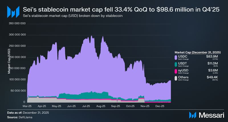 Sei’s stablecoin market cap (USD) fell 33.4% QoQ to $98.6 million by the tip of 2025. USDC accounted for 85.1% of stablecoins on Sei at $83.9 million, although its provide fell 37.1% QoQ. Tether’s USDT comprised 11.2% of Sei’s stablecoins, with provide rising 199.1% QoQ to $11 million after a 78.1% drop in Q3’25.