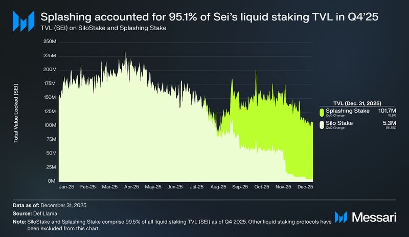 Splashing Stake overtook Silo in Q3’25 and solidified its dominance in This autumn’25, accounting for 95.1% of Sei’s liquid staking TVL (SEI) in comparison with Silo’s 4.9%. The shift in market share was largely as a result of Silo saying its shutdown, which pressured customers to withdraw and unbond iSEI earlier than Dec. 31, 2025. As iSEI wound down, Splashing benefited because the remaining lively LST with established onchain liquidity and integrations.