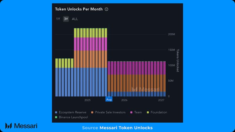 SEI’s circulating provide elevated 5.9% QoQ to six.49 billion, as a result of a mixture of token unlocks and staking rewards. The vesting lower starting in August 2025 will persist into 2026, with SEI vesting at 113 million tokens monthly. In whole, 338.9 million SEI vested in the course of the quarter. With the Basis allocation totally vested, ongoing unlocks are pushed virtually solely by the non-public investor and core staff allocations, which collectively contribute 97.8 million SEI monthly, alongside smaller releases from the ecosystem reserve. SEI tokens will proceed to vest till Aug. 14, 2033.