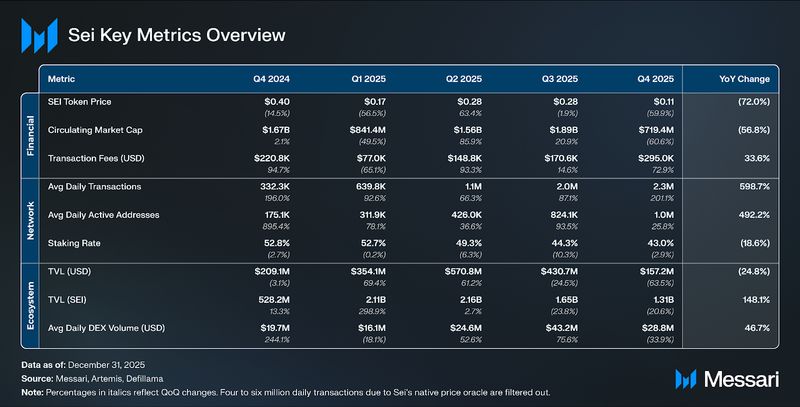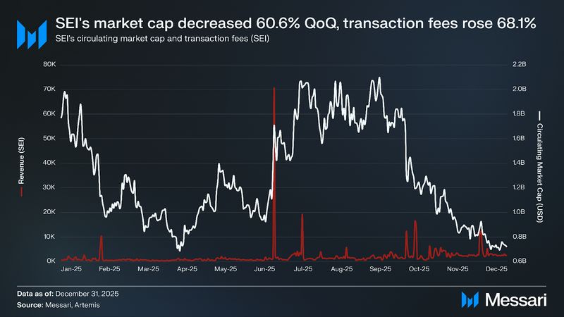SEI bought off sharply in This autumn’25, declining 59.9% QoQ from $0.28 to $0.11. The majority of the drawdown occurred in October 2025, when SEI broke beneath its Q3 buying and selling vary and didn’t get better by means of the rest of the quarter. Whereas no single protocol-specific occasion explains the transfer, the decline coincided with the broader selloff throughout altcoins and fastUSD’s depegging impacting cash markets on Sei.