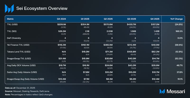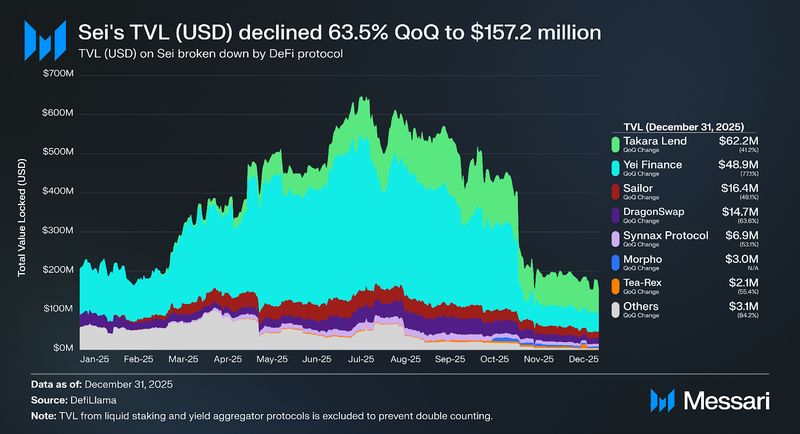 - Sei skilled a pointy reset in DeFi exercise in This autumn 2025 as TVL (USD) fell 63.5% QoQ to $157.2 million alongside a 33.4% QoQ decline in stablecoin provide, reflecting broader DeFi deleveraging in the course of the quarter.