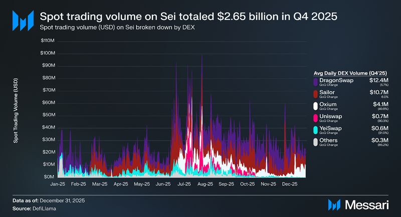 Common each day DEX quantity (USD) on Sei decreased 33.9% QoQ to $28.8 million, however has remained elevated all through 2025 in comparison with 2024. DragonSwap continued to guide exercise in This autumn 2025.