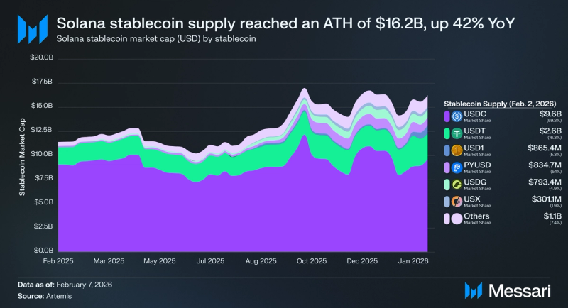 Stablecoins have emerged as the “killer utility” of the Solana network, driven by the blockchain’s high throughput and very low transaction fees. In 2025, the ecosystem experienced a “Cambrian explosion” of issuers, increasing the total stablecoin market cap by 42% YoY to an all-time high of $16.2 billion, as of Feb. 2, 2026. This ranks Solana fourth-highest by circulating stablecoin supply, and third-highest if you only include stablecoins issued natively on the network.