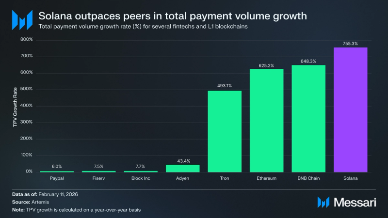As of Feb. 11, 2026, Solana’s Complete Cost Quantity (TPV) progress fee considerably outperformed each conventional fintech giants and peer Layer-1 (L1) blockchains, growing 755.3% YoY. That is almost triple the median progress fee of 268.24%.