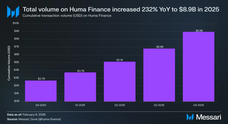 Following its 2024 merger with Arf, Huma’s transaction quantity elevated 232% to $8.9 billion in 2025. Huma is making the worldwide financial system sooner and extra capital-efficient. By Feb. 2, 2026, the protocol had originated $4.2 billion in credit score.
