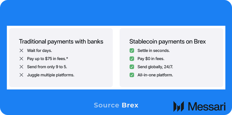 - Zero-Charge International Settlement: Brex permits customers to ship stablecoin funds that settle in seconds throughout borders without cost, eradicating the hidden prices and delays of legacy banking rails.