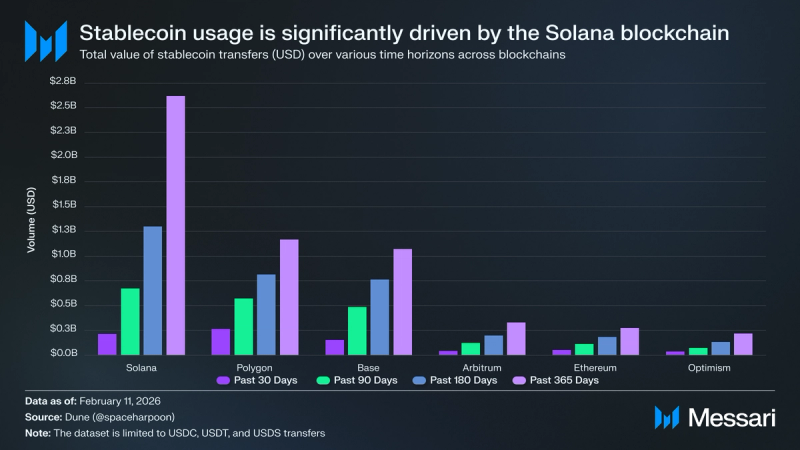 Solana maintains a distinct lead in stablecoin usage, facilitating $2.61 billion in P2P transfers over the past year, 46% of all P2P stablecoin volume among its peers, and more than doubles the annual volume of its nearest competitor, Polygon ($1.16 billion). This lead in 90, 180, and 365-day horizons underscores a structural preference for Solana’s fast finality and near-zero fees.