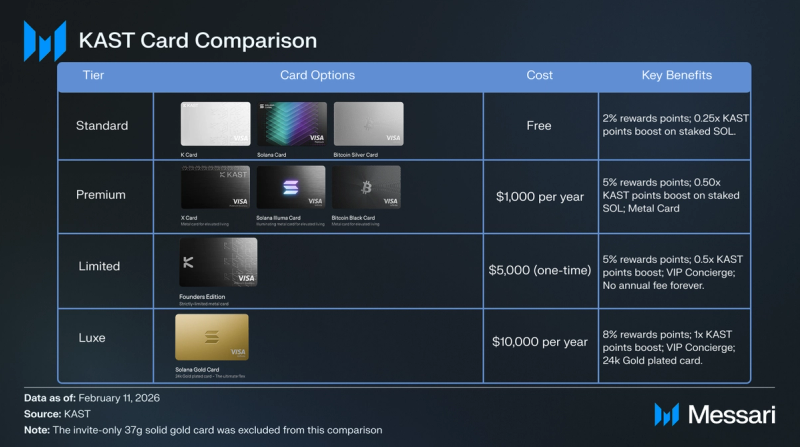 The KAST card ecosystem supplies a multi-tiered strategy to onchain spending, scaling from a free, entry-level plastic card to high-end, steel, and gold-plated editions. Every tier will increase the person’s incomes potential by means of tiered reward factors on card spend and a factors increase on staked SOL, which scales from 0.25x to 1x. Whereas the higher-level Premium and Luxe tiers require an annual price, they provide enhanced advantages, together with VIP concierge entry and considerably larger reward charges.