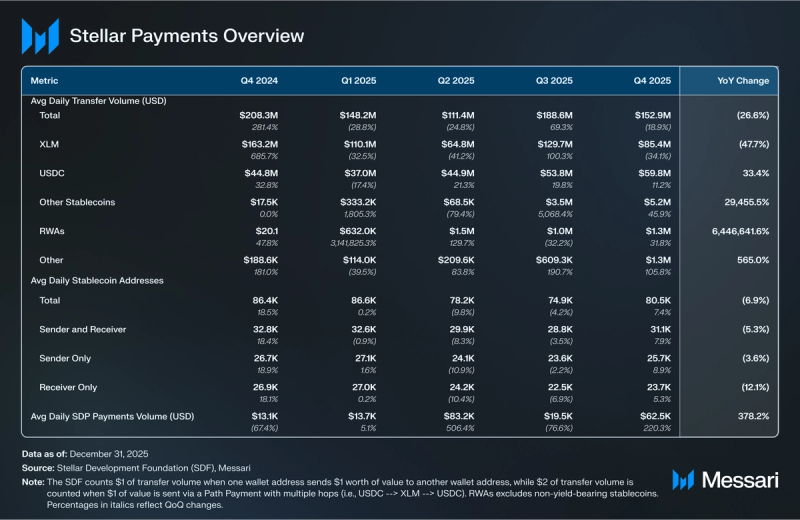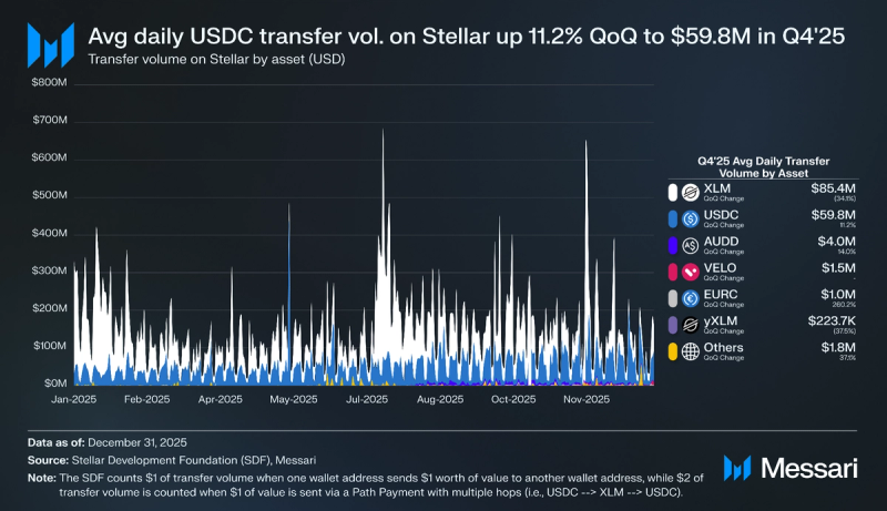 In This fall 2025, Stellar community had a median transaction price of $0.00061, underscoring the community’s affordability for funds. SDF counts $1 of fee quantity when one pockets tackle sends $1 price of worth to a different pockets tackle, whereas $2 of fee quantity is counted when $1 of worth is shipped by way of a Path Cost with a number of hops (i.e., USDC –> XLM –> USDC). Messari counts this exercise as switch quantity.