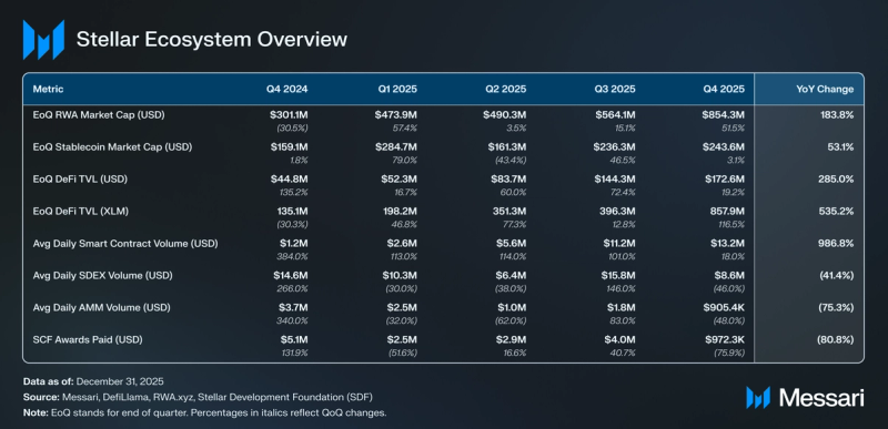 This fall 2025 and past have been momentous for Stellar. The RWA market cap on Stellar (excluding stablecoins) surpassed $1 billion on Jan. 21, and elevated 184% in 2025 from $301 million to $855 million. Furthermore, the stablecoin market cap on Stellar elevated 53% year-over-year from $159 million to $244 million, pushed by PayPal’s PYUSD launch on the community in September, and USDC’s 45% YoY improve in market cap to $223 million. This growth is being validated by institutional adoption, as U.S. Financial institution is testing customized issuance of its personal stablecoin on Stellar, underscoring the community’s attraction because of its reliability (>99.99% uptime), affordability (settlement at <1 U.S. cent), and built-in asset controls for regulatory compliance. On high of this, in December, the Marshall Islands accomplished the world’s first onchain common primary revenue disbursement by a nationwide authorities on Stellar.