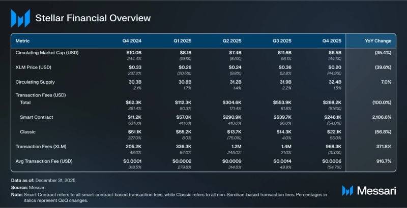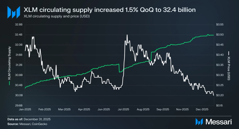XLM ended This fall 2025 because the Seventeenth-largest crypto asset by market capitalization at $6.49 billion (-44.1% QoQ), underperforming the mixed market capitalization of BTC, ETH, and SOL, which decreased by 24.4% QoQ. XLM’s worth decreased 44.9% QoQ from $0.36 to $0.20, with the 0.8% discrepancy between market cap and worth because of a 1.5% QoQ improve in circulating provide to 32.4 billion XLM. 12 months-over-year (YoY), XLM’s circulating market cap declined 35.4% from $10.05 billion on the shut of This fall 2024.