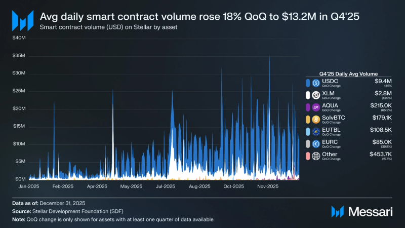 SDF defines good contract quantity as any good contract invocation that causes a token motion (fee, switch, deposit, lend, and so forth.). Common each day good contract quantity rose 18% QoQ from $11.2 million to $13.2 million in This fall 2025. Soroswap and Aquarius are the highest DEXs by quantity, adopted by Phoenix, whereas Mix is the main overcollateralized lending and borrowing protocol. Sensible contracts on Stellar averaged $9.4 million (+42% QoQ) in each day USDC quantity in This fall 2025, adopted by $2.8 million in XLM (-14% QoQ), $215,000 in AQUA (-65.2% QoQ), $179,100 in SolvBTC, $108,500 in EUTBL, and $84,960 in EURC.