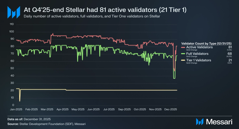 The community additionally ended 2025 with 68 full validators (lively validators additionally publishing a public historical past archive), down from 71 on the finish of Q3 2025. The community is successfully run by Tier 1 Organizations, a gaggle of organizations that usually run three validators and coordinate their quorum units with each other. Collectively, Tier 1 Organizations bear the protection and liveness of the community, given that almost all different validators require their settlement underneath the SCP. SDF acts as a coordinator amongst Tier 1 Organizations to make sure community well being, whereas every Tier 1 Group maintains management over its quorum set. Since April 2025, there have been seven Tier 1 organizations, every working three full validators, for a complete of 21 Tier 1 validators. These are Blockdaemon, Creit Applied sciences, Franklin Templeton, LOBSTR, Public Node, SatoshiPay, and SDF.