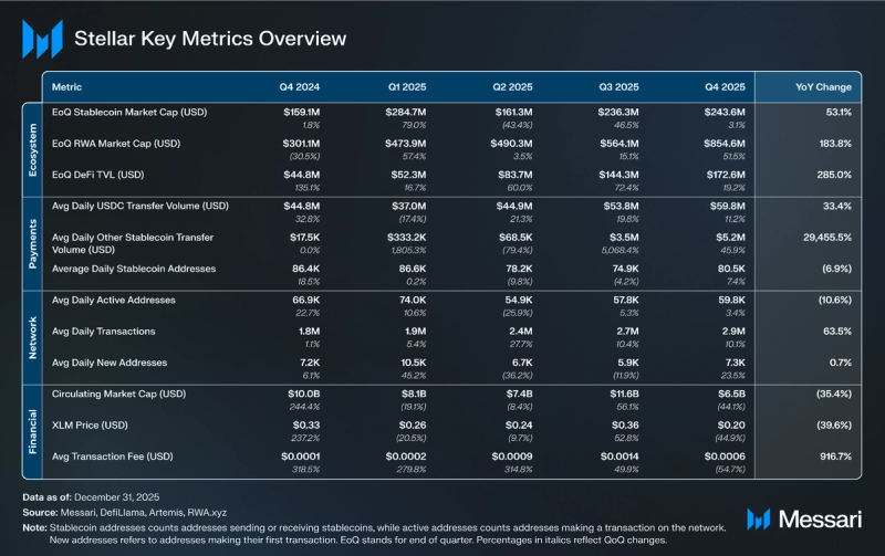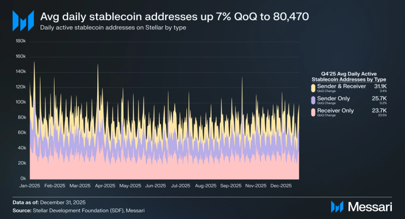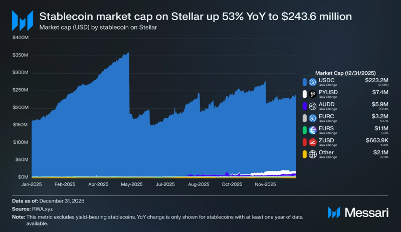In 2025, the stablecoin market cap on Stellar elevated 53.1% year-over-year from $159.1 million to $243.6 million, pushed by USDC’s 44.6% YoY improve to $223.2 million and PayPal’s PYUSD launch on the community in September 2025. The launch of PYUSD is especially helpful for these already aware of and immediately utilizing PayPal’s present monetary infrastructure built-in with PYUSD, and marks a second main U.S. greenback stablecoin provided on the community, delivering near-immediate settlement and lowered friction for on a regular basis transactions in addition to entry to PayFi options for small companies.