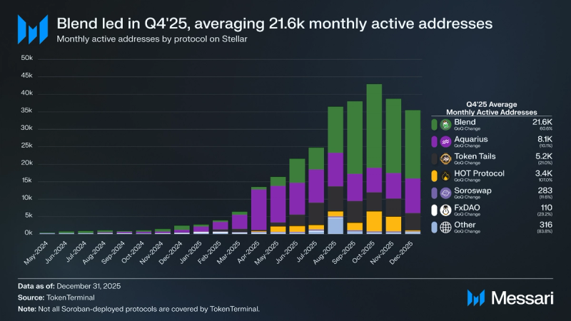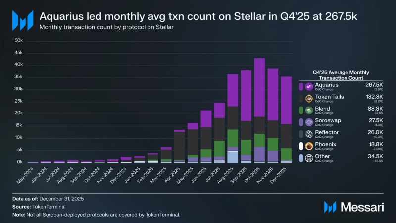 Aquarius led all protocols in This fall 2025, averaging 267,460 month-to-month transactions (-3% QoQ), adopted by Token Tails with 132,320 (-8% QoQ), Mix with 8,830 (+83% QoQ), and Soroswap with 27,510 (-4% QoQ).