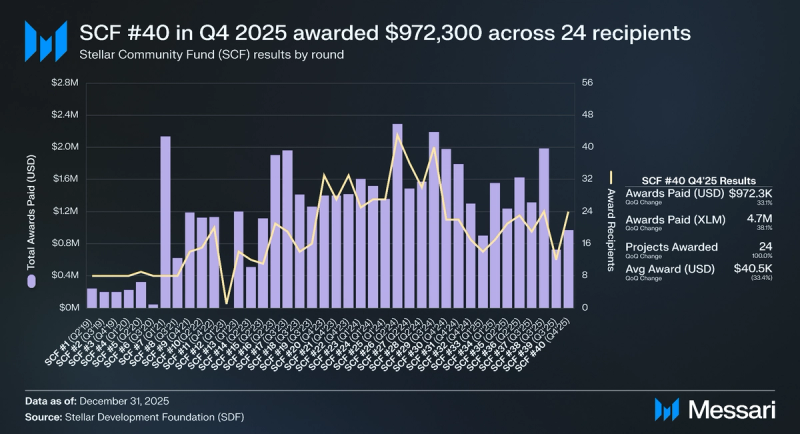 SCF #40 accomplished in December 2025 and has paid $972,300 to this point throughout 24 recipients, with a complete of $2.2 million awarded. Different SDF grants and funding packages embody a bug bounty program, an identical fund whereby SDF matches investments as much as $500,000 for Pre-seed to Collection B firms eager about constructing on the Stellar community, tutorial analysis grants, and advertising and marketing grants for initiatives constructed on Stellar.