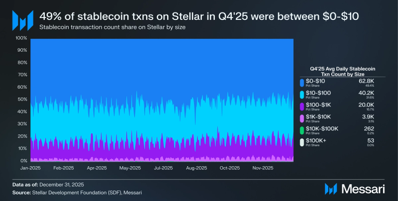 In This fall 2025, 36.5% of stablecoin switch quantity on Stellar was transfers of under $100,000, particularly, 13.5% between $1,000 and $10,000, 11.2% between $10,000 and $100,000, 9.4% between $100 and $1,000, and 0.2% between $0 and $10. Notably, there was outsized quantity within the $1,000 to $10,000 fee band, because it had extra quantity than the $10,000 to $100,000 band.
