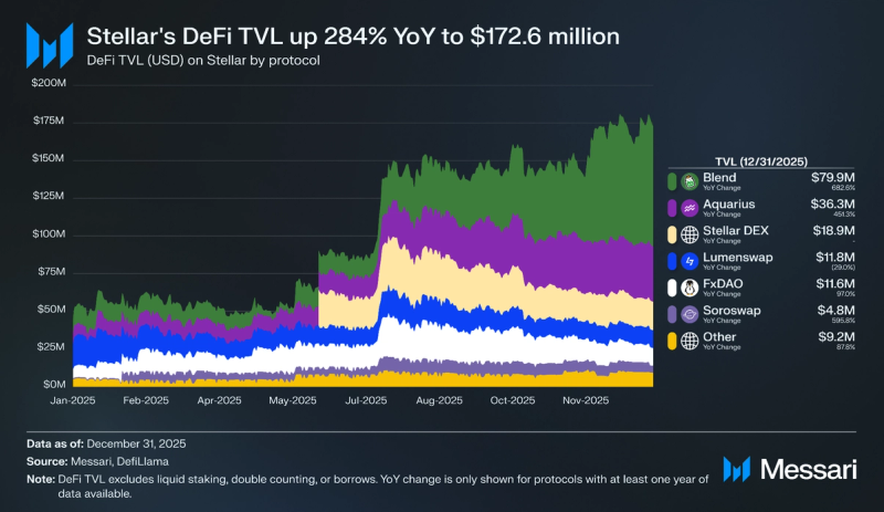 DeFi total-value locked (TVL) on Stellar elevated 284% in 2025 from $44.9 million to $172.6 million. The vast majority of development got here from overcollateralized lending and borrowing protocol Mix, which grew 7.8x YoY from $10.2 million to $79.9 million. APY on USDC deposited on Mix has ranged between 12-18% in current months, a really enticing price in comparison with established overcollateralized lending and borrowing protocols like Aave V3 and SparkLend, which have ranged between 2-7% APY.