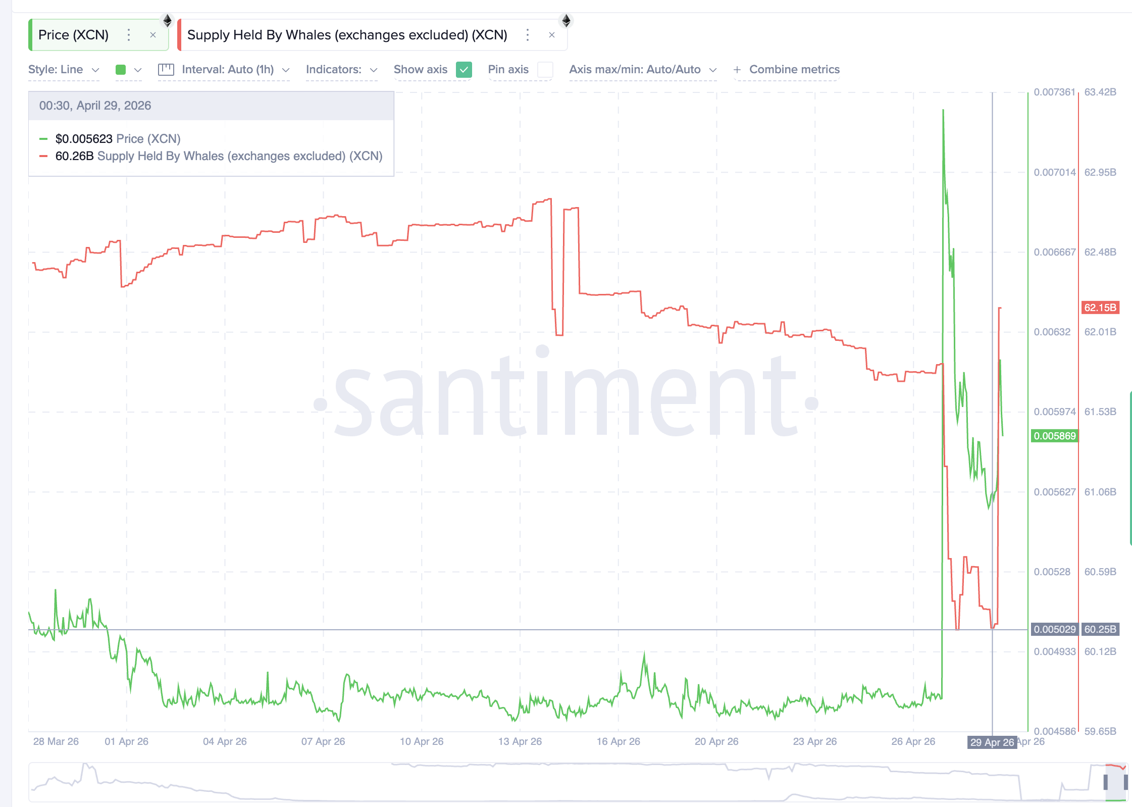 That distribution has now reversed. Whale accumulation has lifted the metric again to 62.15 billion XCN within the hours earlier than the April 29 FOMC resolution, recovering almost 1.9 billion tokens. The timing issues as a result of the broader crypto market is up at press time as merchants rotate out of the S&P 500 forward of Powell’s press convention. Whales seem like positioning XCN as a beneficiary of pre-FOMC liquidity flowing into altcoins.