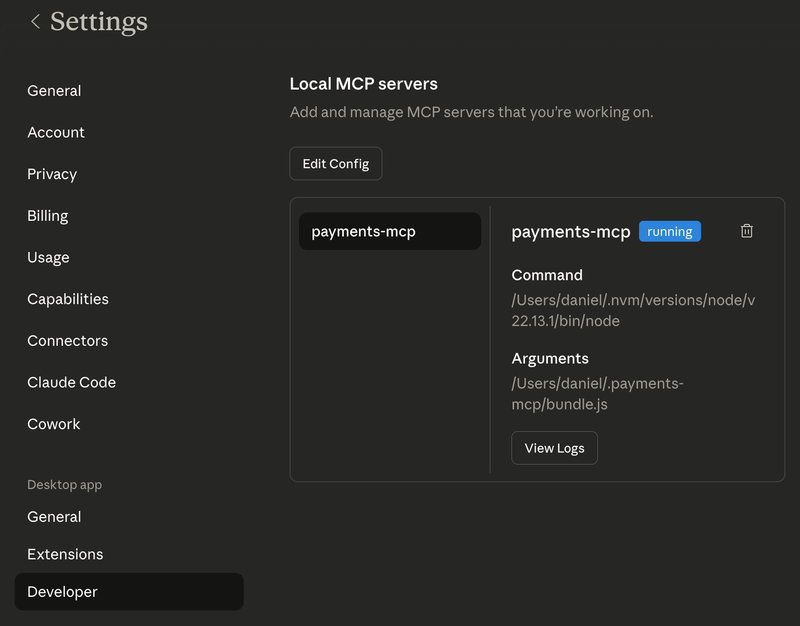 Now when you launch Claude Desktop it is best to see the payment-mcp listed underneath “Local MCP Servers”