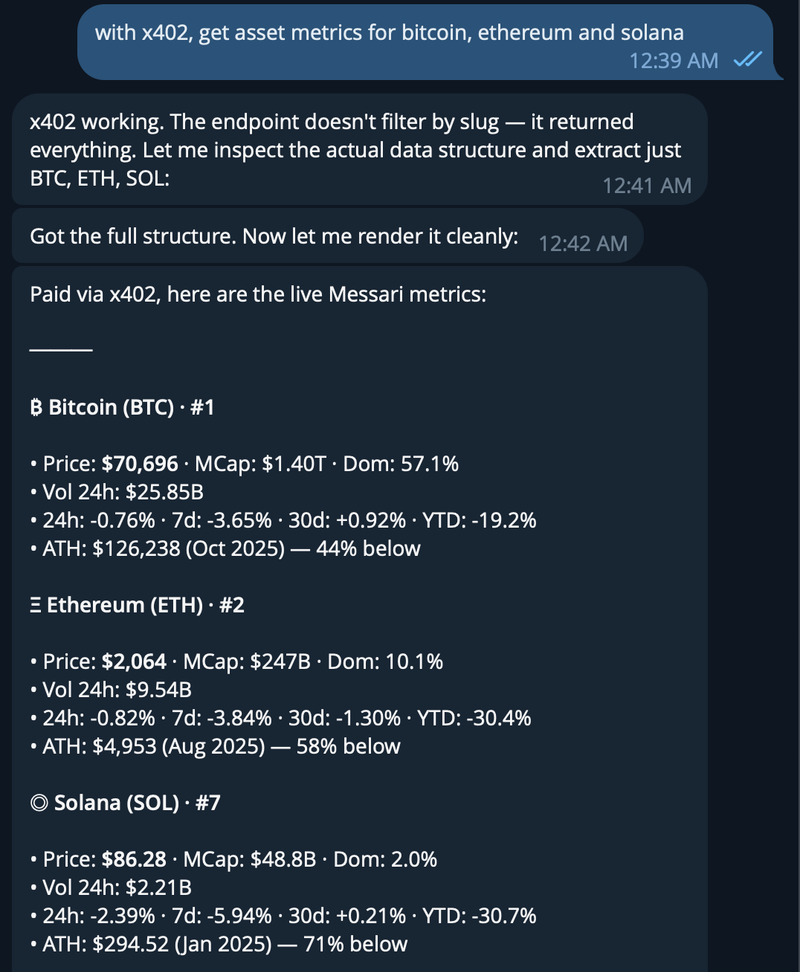 We see x402 because the bridge. It brings Messari’s institutional-grade information onto a wider set of builders with out compromising the depth or high quality that our enterprise prospects depend on. A developer in Lagos can question Messari’s AI chat endpoint for a crypto market abstract and pay $0.10 in USDC. An autonomous agent managing a DeFi portfolio can pull real-time asset information, token unlock schedules, and market alerts — paying per request, no contract wanted.