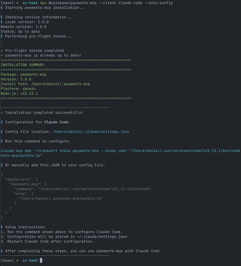 npx @coinbase/payments-mcp@newest --client claude-code --auto-config